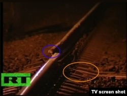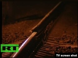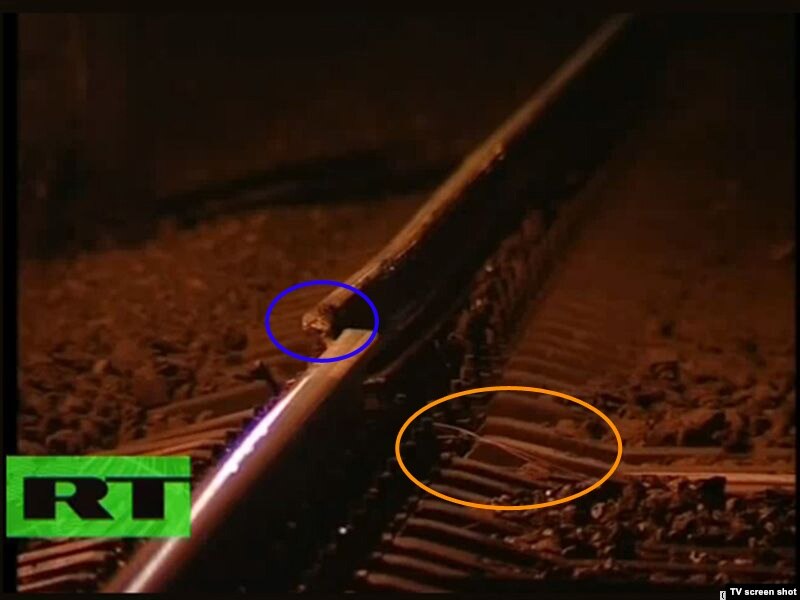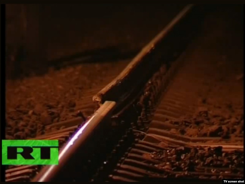 - Телеканал "Russia today" показал ночную съемку места разрыва рельса. Она отличается от того, что показали утром по НТВ. Большой воронки не видно. Видно, что, рельс разошелся, но кусок рельса не вырван. Шпалы повреждены, но на месте.