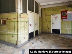 – Это как у нас в Амстердаме грузовой велосипед! Ага, теперь я ее вижу! Вот какая ваша работа на меня произвела колоссальное впечатление. Меня поражает контраст серого, знакомого нам – мне во всяком случае, по детству в Советском Союзе – унылого, беспросветного, бесперспективного чего-то и веселого узора, который нанесен на стену, который вызывает ассоциации с разными художниками, от Эль Лисицкого до Мондриана. Этот узор трансцендентный немного, начинаешь сразу думать о надеждах в физике 60-х годов, в науке, “мы в космос полетим”, и он до сих пор несет эту веселую надежду, эту веру в будущее, хотя зритель прекрасно понимает, что это уже артефакт. Но все равно этот заряд остался. Такой контраст меня больше всего привлек. Я помню, что очень долго смотрела на этот снимок.