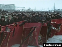 – Это Российский государственный архив кинофотодокументов в Красногорске. Это вторая картина, которую я делаю в сотрудничестве с Красногорским архивом. Первой был "Процесс", и эта картина выросла из "Процесса". Когда я собирал материал для "Процесса", я там же копировал похороны советских деятелей, которые погибли, умерли или были убиты в период сталинского правления. Прощание проходило в Колонном зале Дома Союзов, там же, где и процесс Промпартии и где потом прощались со Сталиным. После фильма "Процесс" я думал сделать картину о тех, кого Сталин так или иначе сжил со света. Потом в декабре прошлого года на премьере фильма Николая Изволова "Первая годовщина" – это восстановленный фильм Дзиги Вертова – я сидел с Риммой Максимовной Моисеевой, заместителем директора Архива, и поделился своей идеей. Римма Максимовна сказала: "О, у нас только о сталинских похоронах двести коробок". В январе мы сделали копии нескольких коробок, и после этого я принял решение делать картину. Это материал, который снимался для фильма "Великое прощание". Мы упомянули в титрах всех операторов, около двухсот человек. Представляете, какой масштаб! 10 тысяч метров было снято. Снимали по всей стране, с 6 по 19 марта. Режиссеры – Илья Копалин и Сергей Герасимов, где-то я видел упоминание Александрова как режиссера, где-то Чиаурели.