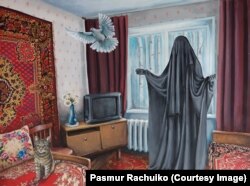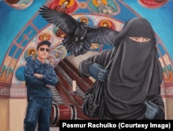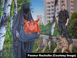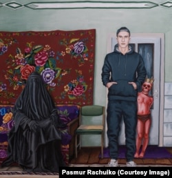 Изначально я работал со своими триггерами, они связаны были в том числе с локальной российской повесткой. Ты начинаешь работать с образами, расширять свою авторскую мифологию и в какой-то момент перестаешь контролировать этот процесс, потому что всё разворачивается как эпос. В определенный момент они начинают жить своей жизнью. Мне очень сложно какие-то установить связи. Полицейский это в принципе символ России, и не только современной. У женщины в хиджабе много разных коннотаций. Я с Северного Кавказа, рос в 90-е годы. Все, что происходило вокруг чеченского конфликта, очень сильно на меня повлияло. Когда я был маленький, посмотрел фильм Хусейна Эркенова "Холод" про депортацию карачаевцев, он оказал сильное влияние на меня. Когда начинаешь анализировать свою живопись, ты понимаешь, что она произошла как некоторый терапевтический акт. Мне поначалу это было тяжело очень признать в силу того, что я уже начал себя идентифицировать как художник, мне всегда казалось, что терапевтичность моей художественной практики как-то нивелирует профессионализм. Но в конечном итоге мне кажется, что профессиональнее оставаться честным с самим собой и с публикой.