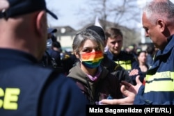 Активистка Саломе Баркер в маске, раскрашенной в цвета ЛГБТ-флага, возле Тбилисского городского суда 4 апреля 2022 года.