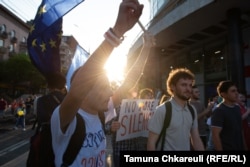 Тбилиси, 24 июня. Участники акции в поддержку евроинтеграции Грузии. Тысячи человек вышли на улицы города после того, как Грузии было отказано в предоставлении статуса кандидата в члены ЕС. Основные требования европейских чиновников, которые должна выполнить Грузия для получения этого статуса – "деолигархизация" и деполяризация политической жизни, обеспечение независимости судей и неприкосновенности свободы слова. Фото – Тамуна Чкареули, грузинская служба Радио Свобода/Радио Свободная Европа.