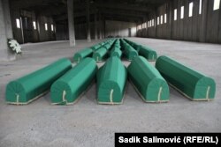 10 июля. Гробы с останками 50 недавно идентифицированных жертв геноцида в Сребренице выстроены в ряд в мемориальном зале Поточари. В 2022 году в Боснии и Герцеговине была 27-я годовщина убийства тысяч боснийских мужчин и мальчиков войсками боснийской Республики Сербской во время войны в 90-х годов. Фото – Садик Салимович, RFE/RL.