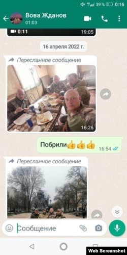 Радио Свобода удалось найти в социальной сети "ВКонтакте" профиль одного из людей на этом видео, 49-летнего Владимира Жданова. Мы списались с его другом, который подтвердил, что на видео именно Жданов, а также рассказал, что в апреле тот уже воевал в Украине. Он прислал скриншот сообщения, которое Владимир Жданов отправлял их общему знакомому 16 апреля. На скриншоте две фотографии: на первой четверо мужчин в камуфляже обедают за столом (Жданов крайний слева). "Побрили!" – пишет Жданов, и отправляет еще одну фотографию, на которой те же люди стоят около памятника царю Федору Иоанновичу в Белгороде.