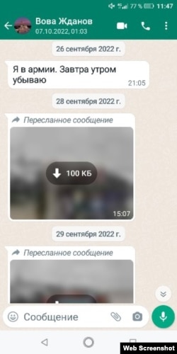 По нашей просьбе знакомый Владимира Жданова выяснил у других его друзей, что после весенней поездки в Украину тот возвращался в Белгород, в августе "что-то натворил по пьяни" и 26 сентября снова уехал на войну уже в рамках "частичной мобилизации". В подтверждение этих слов наш собеседник прислал еще один скриншот сообщения, отправленный Ждановым их общему знакомому в этот день: "Я в армии. Завтра утром убываю". Сам Жданов, как следует из его постов во "ВКонтакте", ранее служил в военной разведке – 5 ноября 2020 года он опубликовал на своей страничке поздравление с Днем военного разведчика, адресовав его "всем причастным".