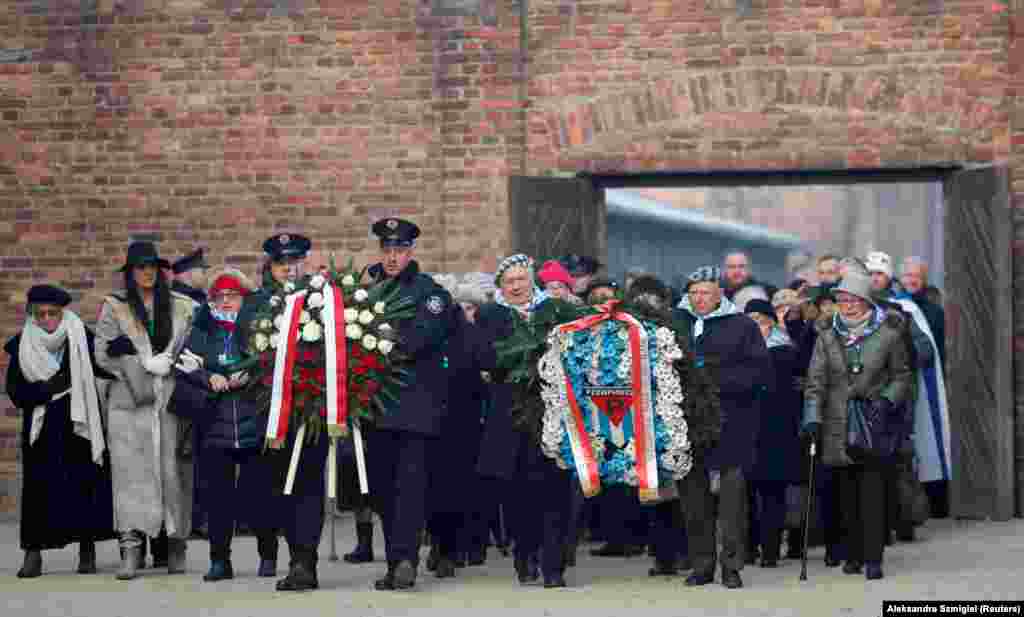 Бывшие узники лагеря несут венок. Освенцим, Польша, 27 января 2020 года