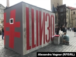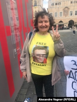 "Я училась в России, не люблю путинскую власть, но люблю российский народ", – говорит жительница Праги Шарка, которая пришла на открытие инсталляции в футболке с призывом освободить Навального.