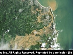 В Австралии в феврале, марте и апреле этого года произошло рекордное наводнение из-за непрекращающихся дождей. За время стихийного бедствия погибли 22 человека. На этом снимке, сделанном спутником 1 марта над городом Кулангатта, хорошо видно, как смешавшиеся с землей потоки воды затопили сельхозугодья и, пройдя через город, достигли океана.