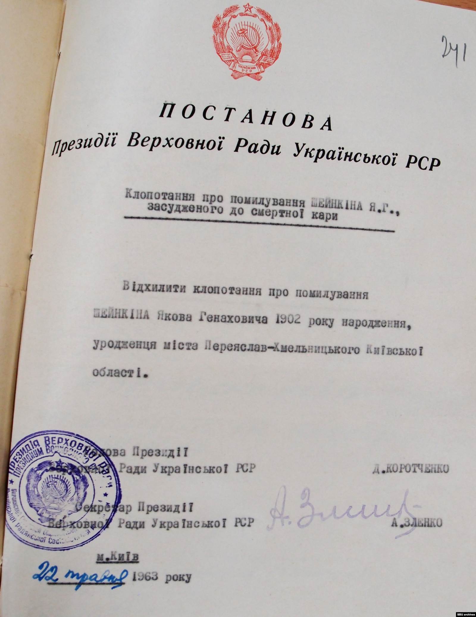 А вот Шейнкин обжаловать смертный приговор уже не мог, поскольку его вынес суд последней инстанции – Верховный (тогда как Шанского судили в Киевском областном). Единственным шансом сохранить жизнь было помилование Верховным Советом УССР.