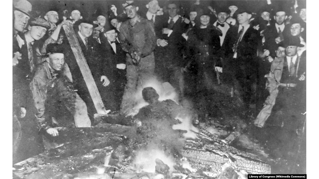 Разъяренная толпа забивает камнями жертву. Фото из газеты Werst Virginian. 31 июля 1919.